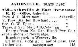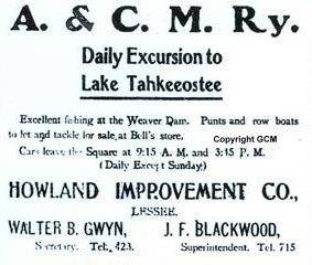 The water impounded by the Weaver Power Company dam was called Lake Tahkeeostee, and proved quite an attraction to summer visitors who were in Asheville in great numbers during the season. More information needed. There was a 'trolley park' there but years unknown.