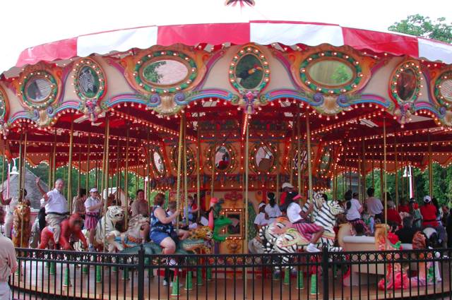 But guess what! As of May 2004, Audubon Park has another carousel -- this one featuring endangered species. It is the result of a gift from the Charlotte Gottesman family. Decorated with oil paintings of Audubon Zoo animals, the carousel was created in San Francisco especially for Audubon Park. Children, and those young at heart, can climb aboard a white tiger or a white alligator or any of the 60 friendly critters, including traditional horses, and twirl around under the brightly striped canopy behind the Cooper Plaza's elephant fountain.