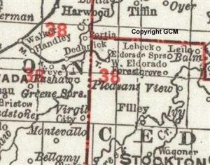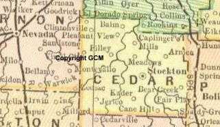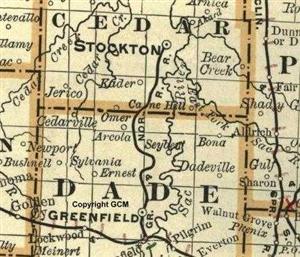The above maps are just 'trivia'. The old town name was Baum. See map. I notice El Dorado Springs got a railroad around 1900. I see a railroad from Greenfield 'north' to Stockton prior to 1900 but it vanishes from maps after 1900. Wonder its destination and what is in Stockton ?