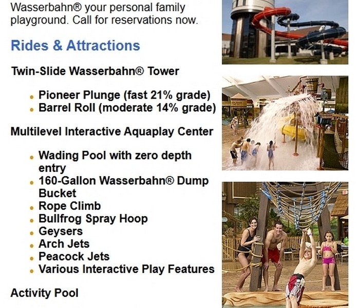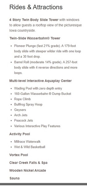 Wasserbahn advertised itself as a resort that celebrates the German heritage of the historic Amana Colonies, featuring a mini-golf course, restaurant and lounge. The Seven Villages restaurant also is listed as closed.