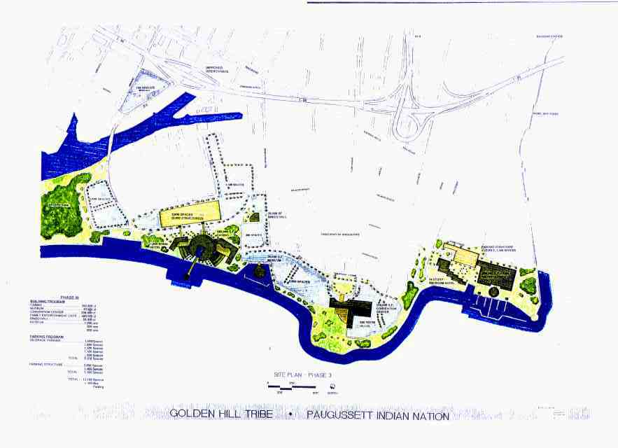 One is inextricably linked to the other. It should also go without saying that a revitalized Bridgeport would represent significant revenues and taxes for the state of Connecticut. The point of this page is to show that these groups are part of a total picture and are linked together. The Tribes proposal is a positive, enthusiastic approach towards helping to revive a once proud city that has been ravaged by social and economic forces. U.S. News & World Report, in a June 24, 1991 article on the city's misfortunes following its declaration of bankruptcy described the following harrowing scene: "Meanwhile folks in Bridgeport struggle on ... For several hours, in a scene straight out of the Depression, Twigg (Ann Twigg a 911 operator) and hundreds of other city Hall workers had to wait while banks and stores reversed themselves. But the chill had already set in. "We worry about how long the city will last Twigg says. It's easy to list the problems that Bridgeport has had to confront over the years. Thousands of jobs lost, consistent double-digit unemployment, high crime, huge business and taxable revenue losses as companies closed or moved elsewhere. Someone has numbers for all of these that can be calculated. What cannot be calculated is the effect this economic devastation has had on the community -- the human side of the story. By taking positive action to restore and economically depressed area, one will begin to see the rebirth of the human side -- pride, dignity, morale. Feeling of hope, a sense of spirit, rededication, optimism, excitement and enthusiasm will spread throughout the entire community. The Tribe will work with Bridgeport's political and business leaders in forging an exiting relationship which can only be mutually beneficial to all involved. Mention will be made later on regarding the Casino Complex project revenues and what they will do to the tax base. Also mentioned will be a special tax revenue sharing arrangement between the Tribe, the city and state. Bridgeport's ability to survive economically places the city in a vulnerable position with regard to its dealings with the state. It makes the city more dependant than ever on the state legislature. Here is the opportunity for the city's leadership to recognize all of the positive connected to the Golden Hill Complex and welcome the Tribe's efforts to work out the land claim settlement in the best interests of both parties.